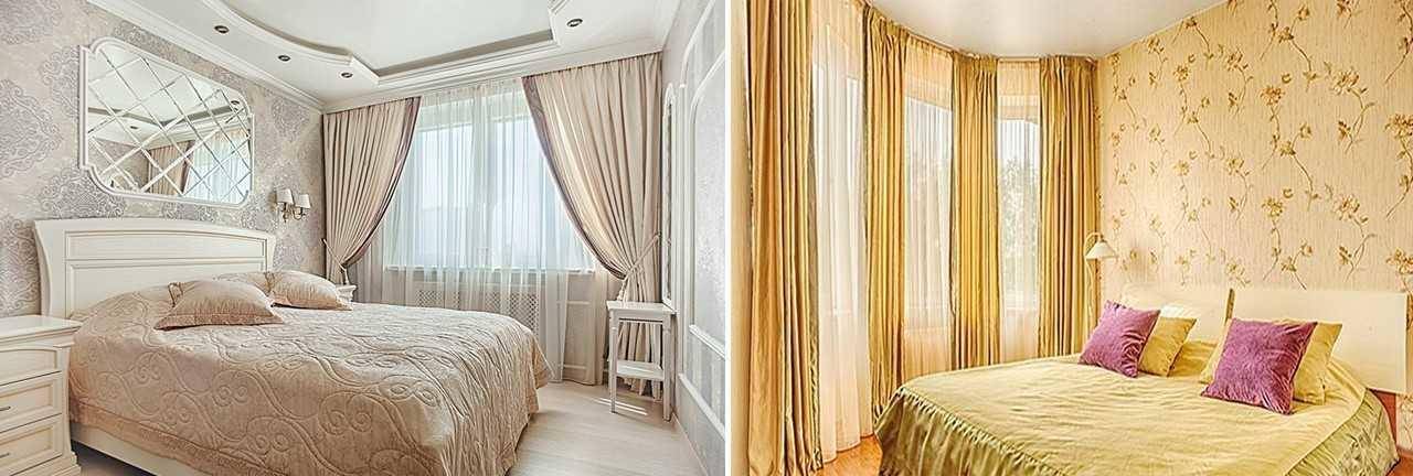 Для спальни подойдут яркие, светлые тона или пастельные оттенки. Драпировка должна быть обязательно густой. Длина штор в спальню должна быть таковой, что бы полотна слегка касались пола.
