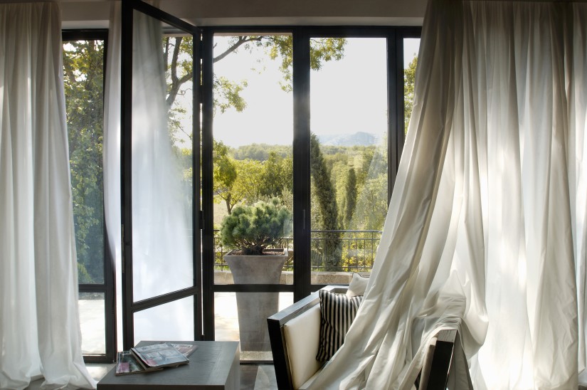 Не обязательно полностью закрывать занавесками балконную дверь. Размыть и оттянуть фокус внимания — достаточно.