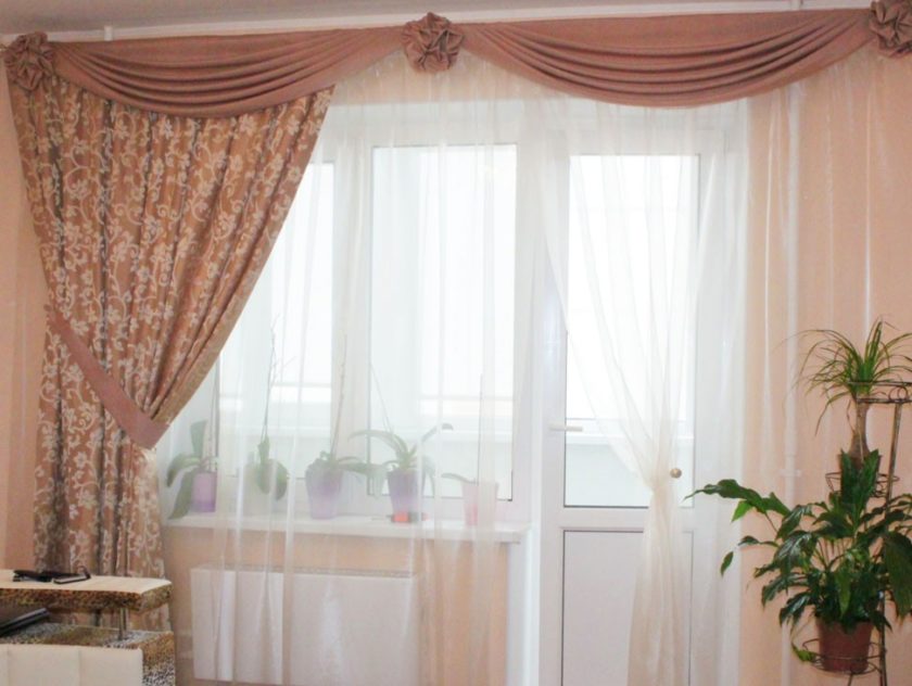 - Чтобы не занимать лишнее пространство помещения, шторы на окна с балконной дверью следует выбирать или делать своими руками меньшего объема и габаритов;