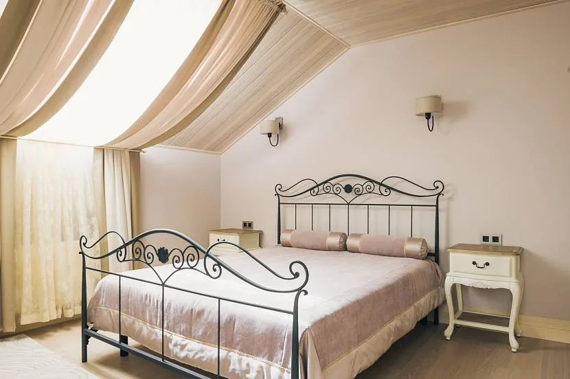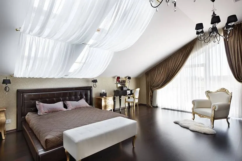 Мансардная спальня в стиле прованс с золотистыми портьерами