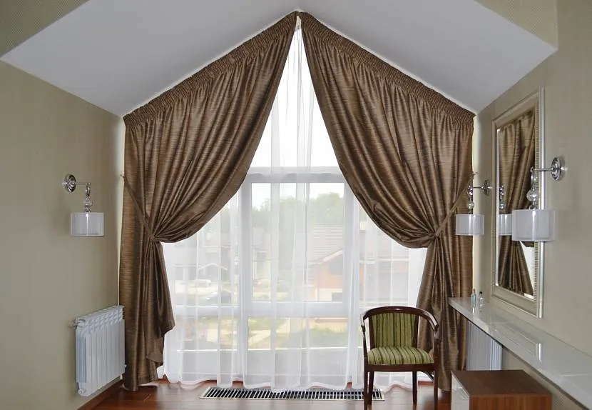 - Треугольные. Крупногабаритные конструкции устанавливаются на фронтоне. При оформлении чаще всего используются фиксированные портьеры, закрепленные на одном или двух наклонных карнизах, размещенных вдоль верхних сторон треугольника. Также можно использовать тюль, гардины с подхватами, установленные на зафиксированных подвесах.