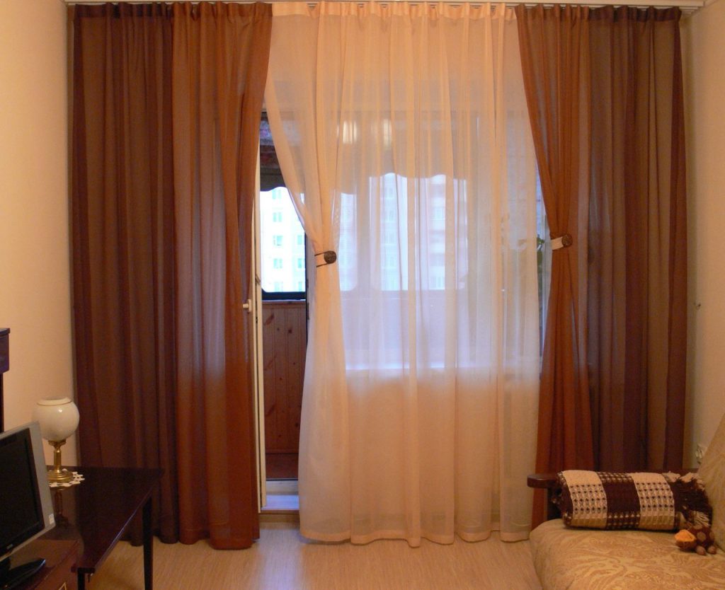 Если балкон, выход на который находится в зале, застеклён и занавешен, окно комнаты можно украсить одним тюлем из органзы или вуали. Это позволит красиво оформить проём, не затемнив помещение.
