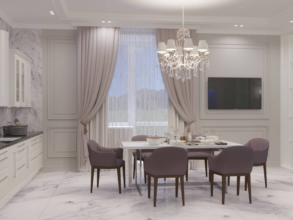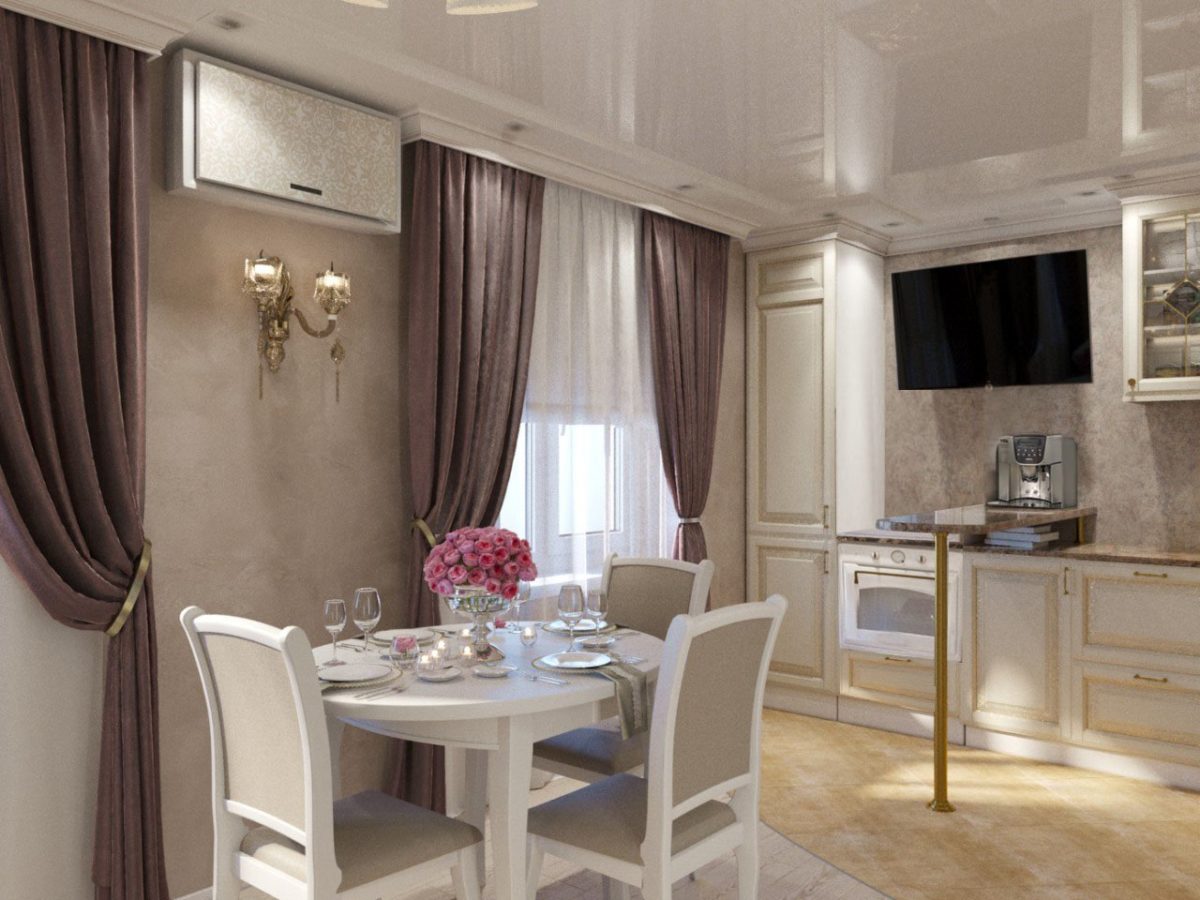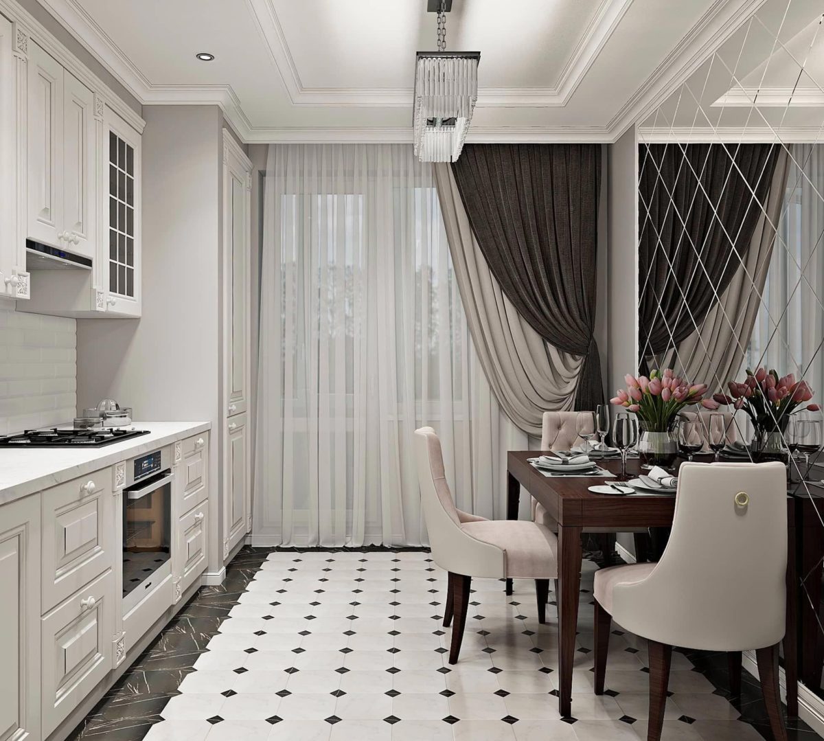 Для маленькой комнаты желательно предварительно сделать замеры и начертить схему расстановки мебели. Для кухни-гостиной в стиле неоклассика уместно применять «кухонный остров», столешницы и подоконники из искусственного камня.