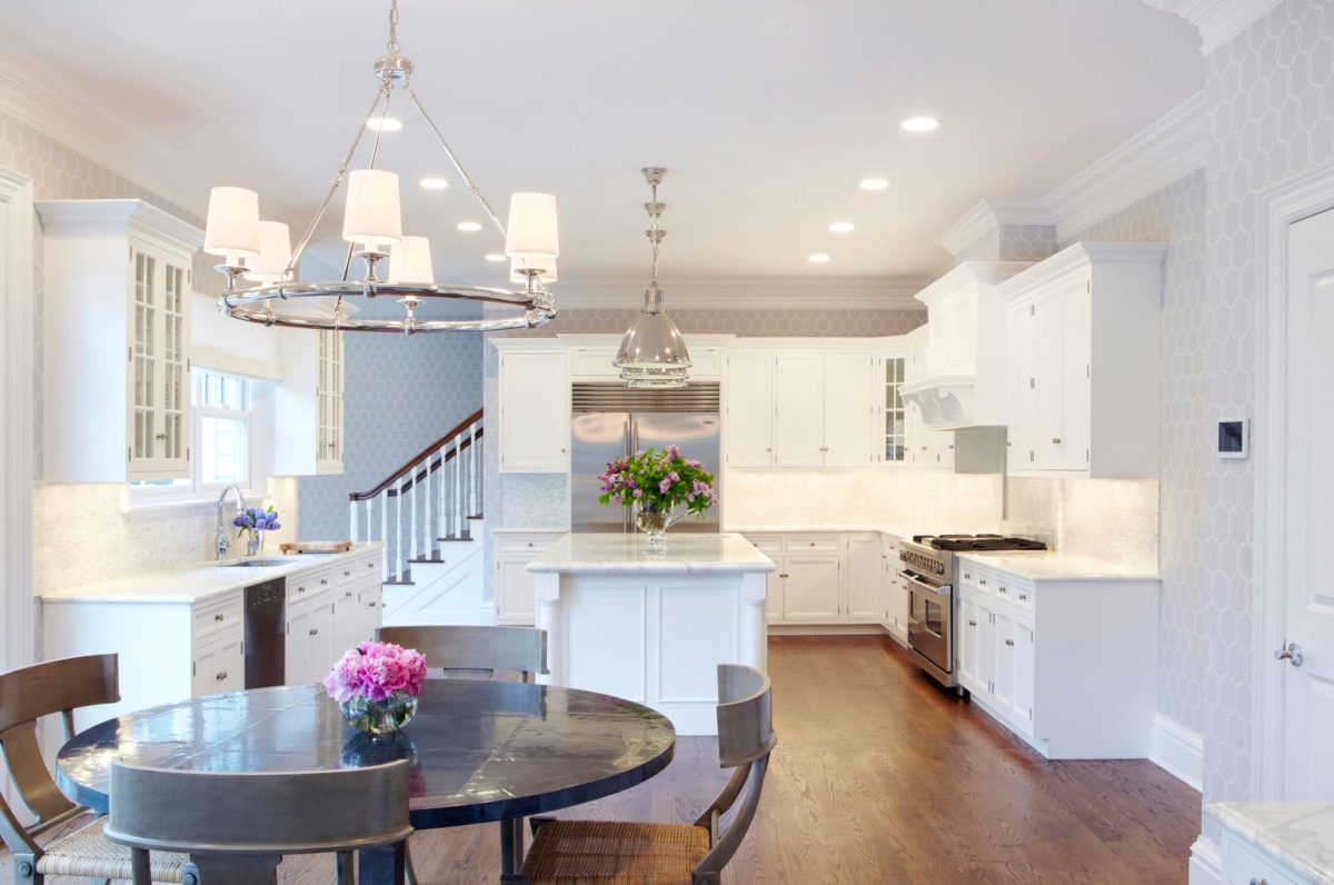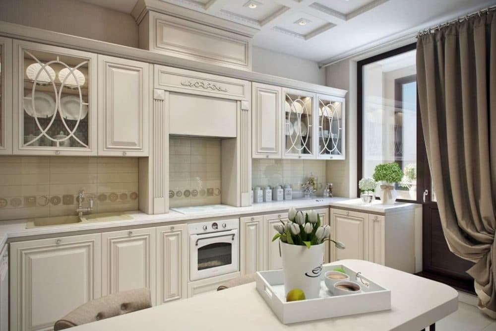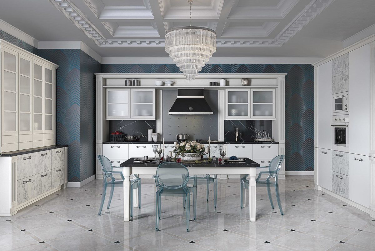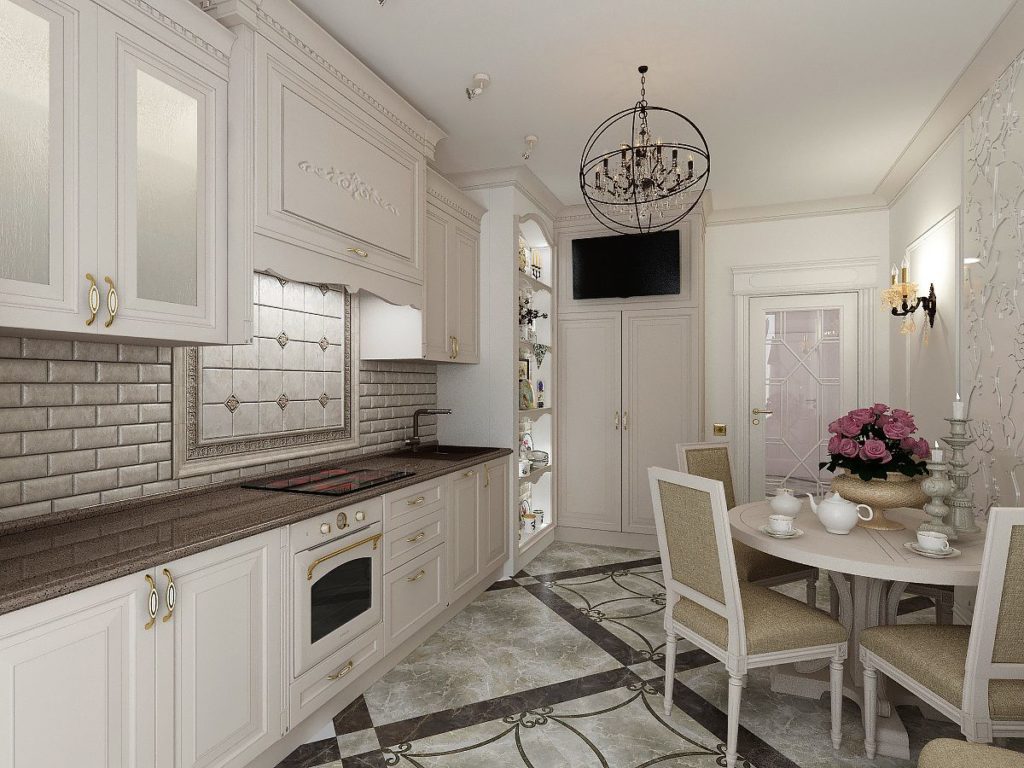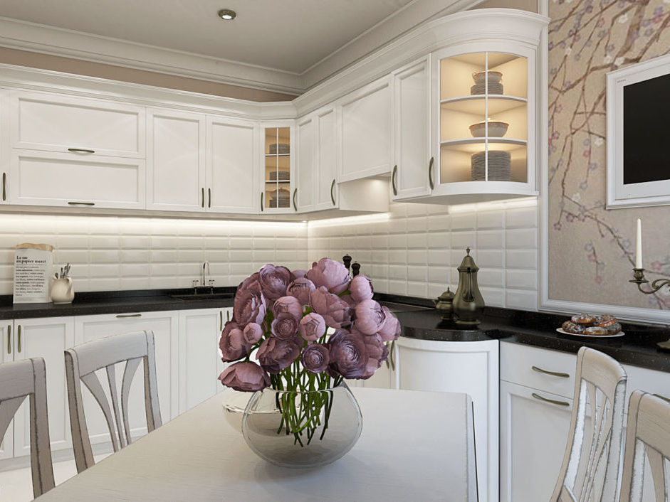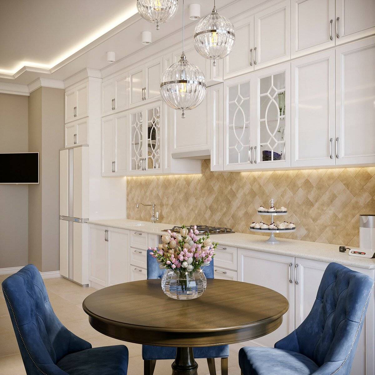 Обои, деревянные панели, штукатурка подходят для оформления стен. Фартук в неоклассике выкладывается плиткой, однотонной или с неброским общим узором
