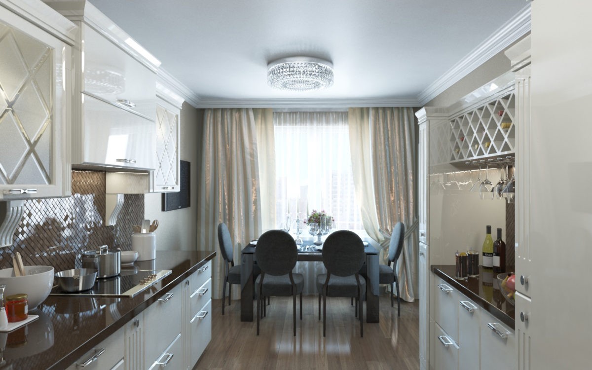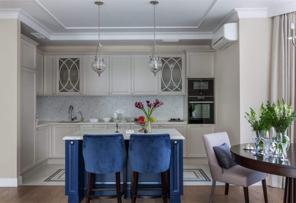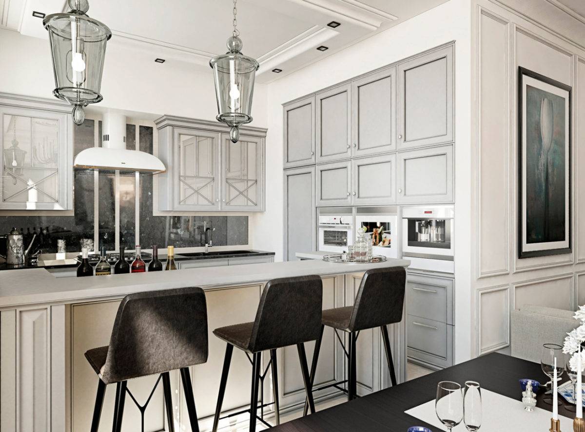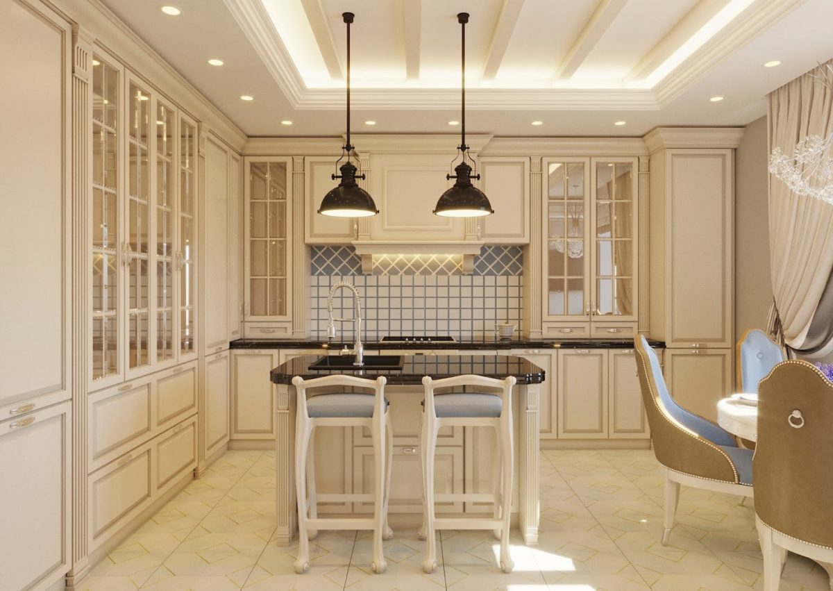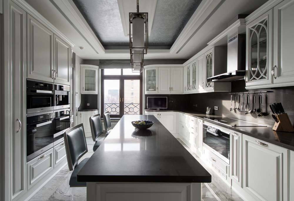 Многоуровневые потолки в неоклассицизме используются с осторожностью, они должны смотреться как продолжение гарнитура или инструмент зонирования (для кухни-гостиной).