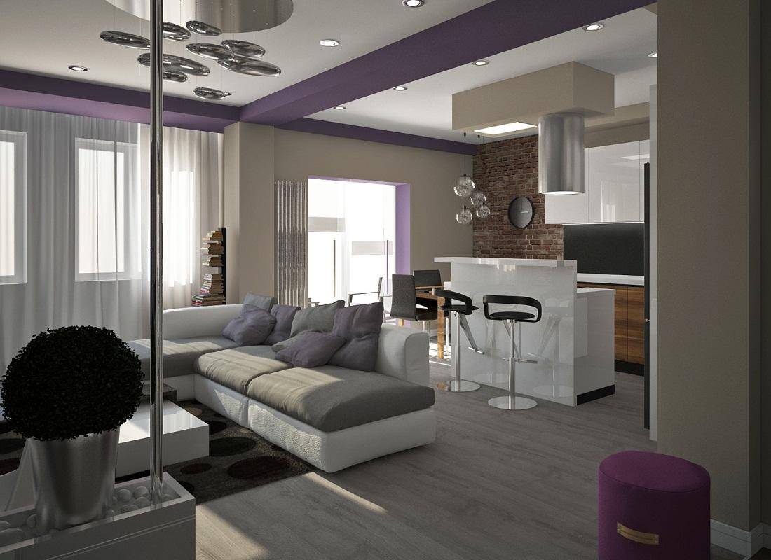 Одной из наилучших вариаций оформления признаны оттенки холодного типа. При помощи темных оттенков гостиную, совмещенную с кухней можно сузить, а при использовании светлого цвета, её можно заметно увеличить.