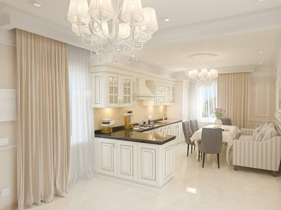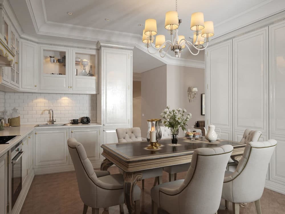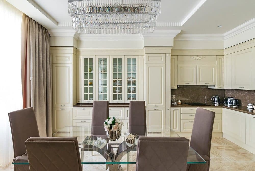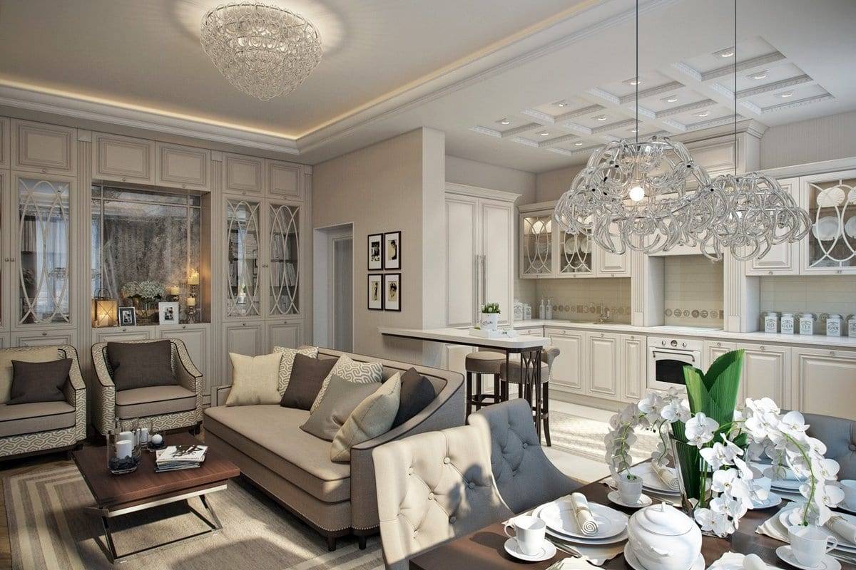 Неоклассику кухни-гостиной подчеркнёт немногочисленный декор. Центральным объектом, как уже было указано, становится люстра. Современные модели, имеющиеся в продаже, полностью отвечают требованиям по экономии электричества и имеют уникальный дизайн.