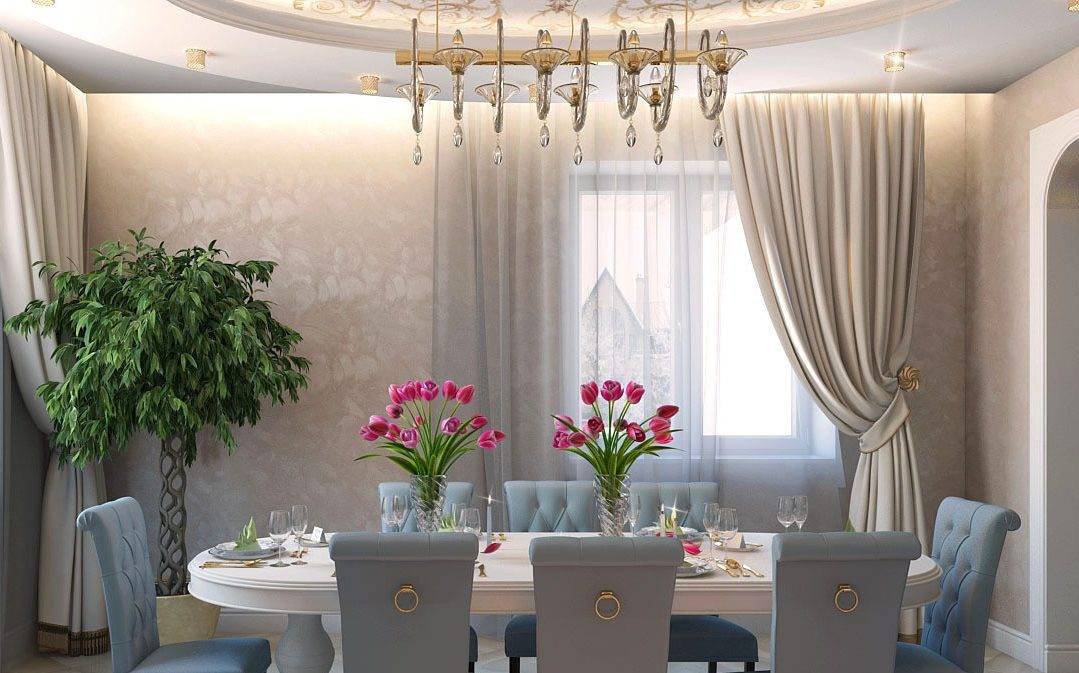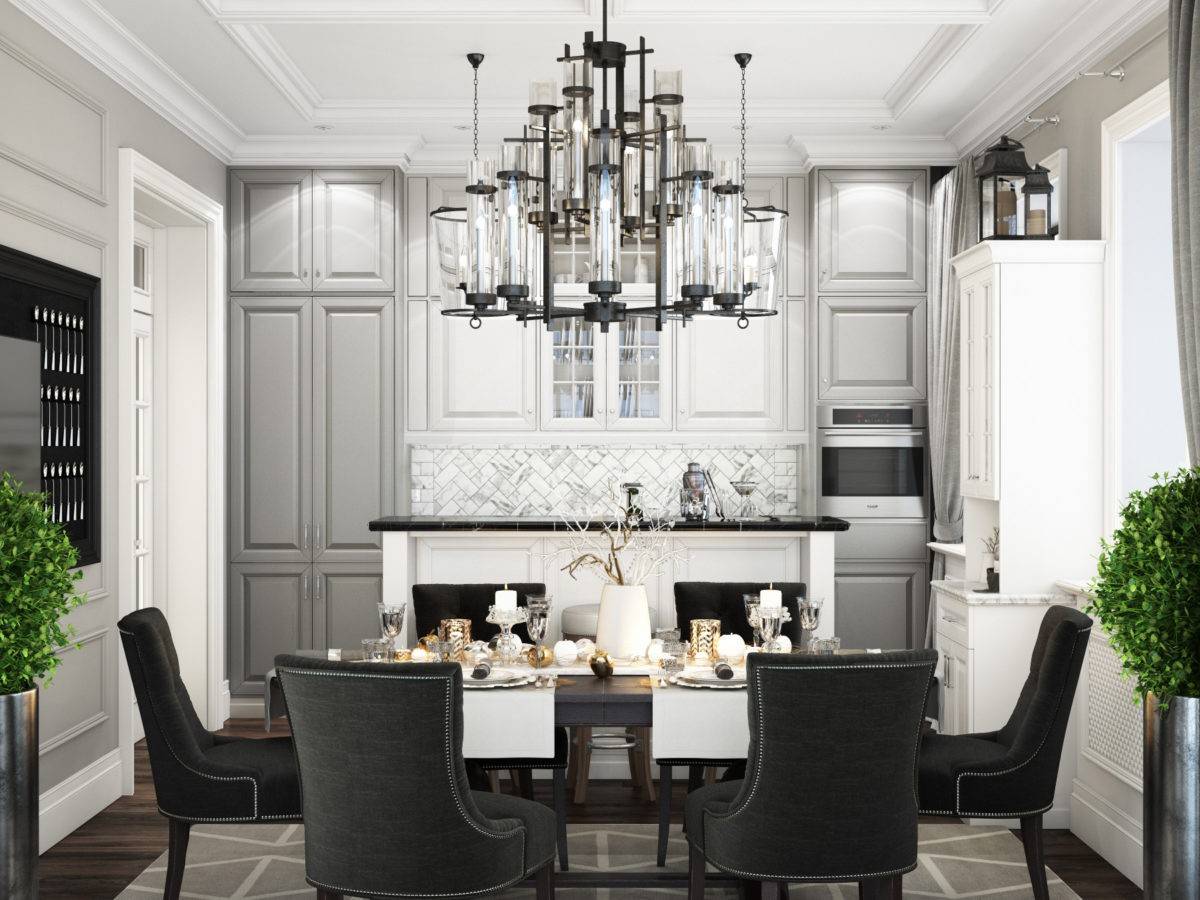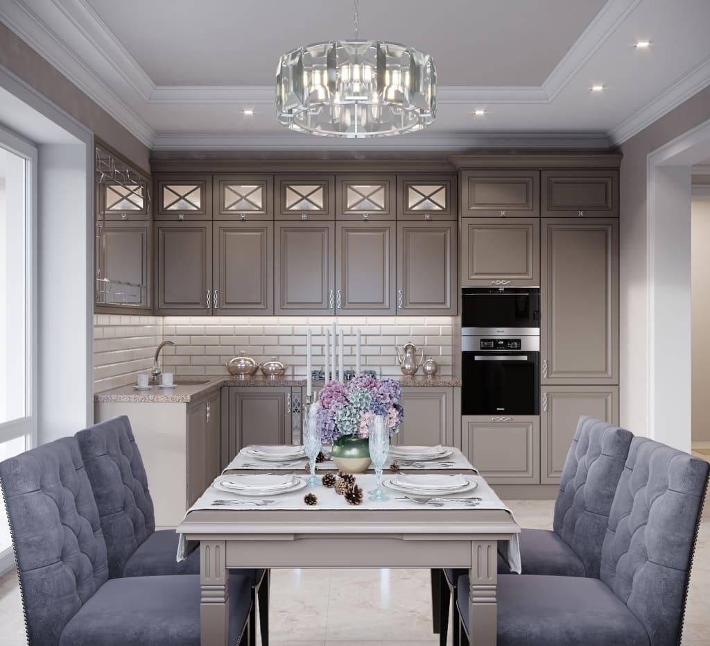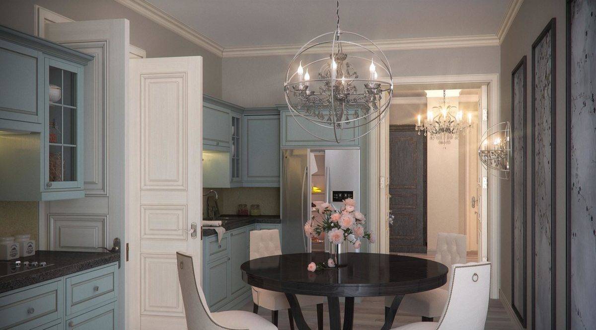 Неоклассику кухни-гостиной подчеркнёт немногочисленный декор. Центральным объектом, как уже было указано, становится люстра. Современные модели, имеющиеся в продаже, полностью отвечают требованиям по экономии электричества и имеют уникальный дизайн.