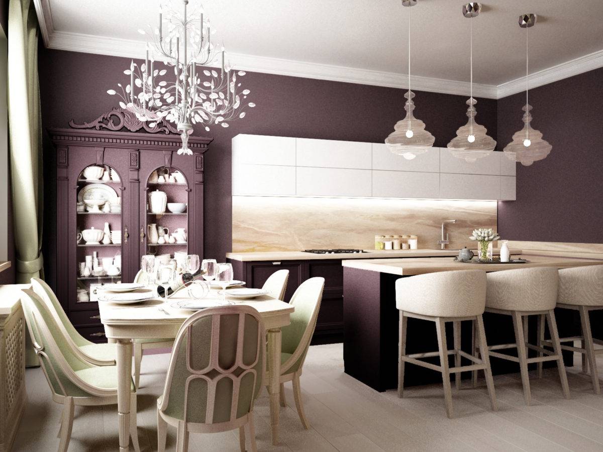Люстры, настенные светильники не только выполняют роль электрификации всей кухни, но и являются основным декором. Шикарная, свисающая с потолка, люстра — это главный элемент, который бросается в глаза при входе в помещение.
