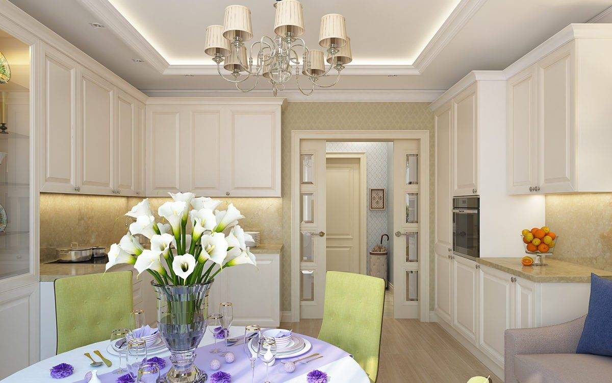 Отделка потолка часто является продолжением цвета стен, но есть и более современные варианты — комбинированные или двухуровневые потолки с ПВХ или атласными полотнами. Глянцевая или фактурная отделка гармонично дополнит кухонный гарнитур и мягкую мебель в гостиной.