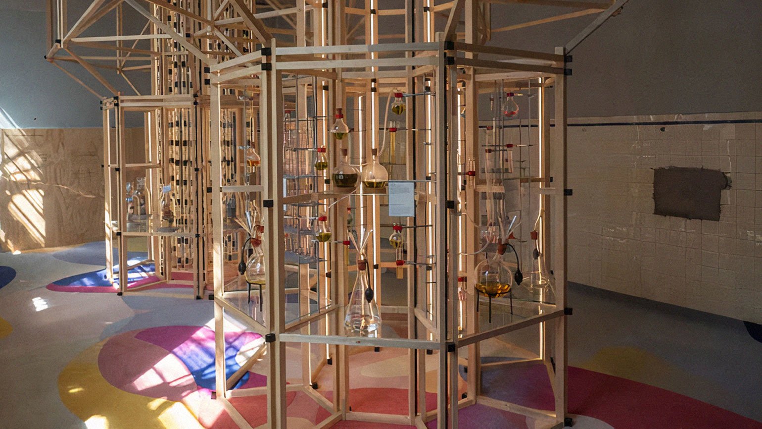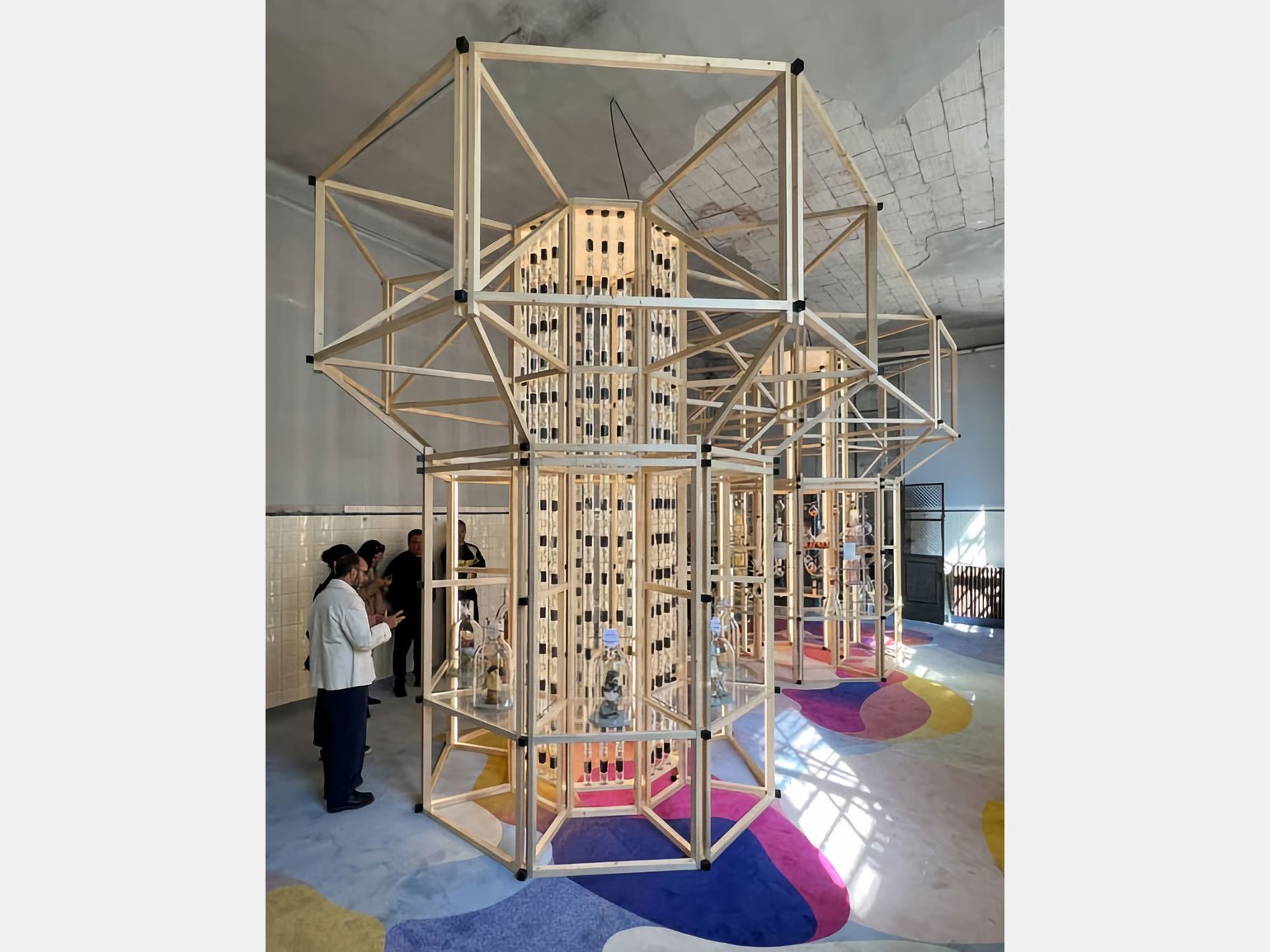 Дизайнеры Фредерик де Вахтер и Альберто Артезани установили две четырёхметровые башни из елей (этот каркас можно использовать несколько раз или легко переработать для других проектов). В первой башне под стеклянными куполами поставили глиняные скульптуры, покрытые духами, а сверху закрепили круглый веер — его можно покрутить и так выпустить аромат наружу. Во второй башне в разноцветные мензурки залили туалетную воду — каждый оттенок жидкости в них соответствовал определённому аромату.