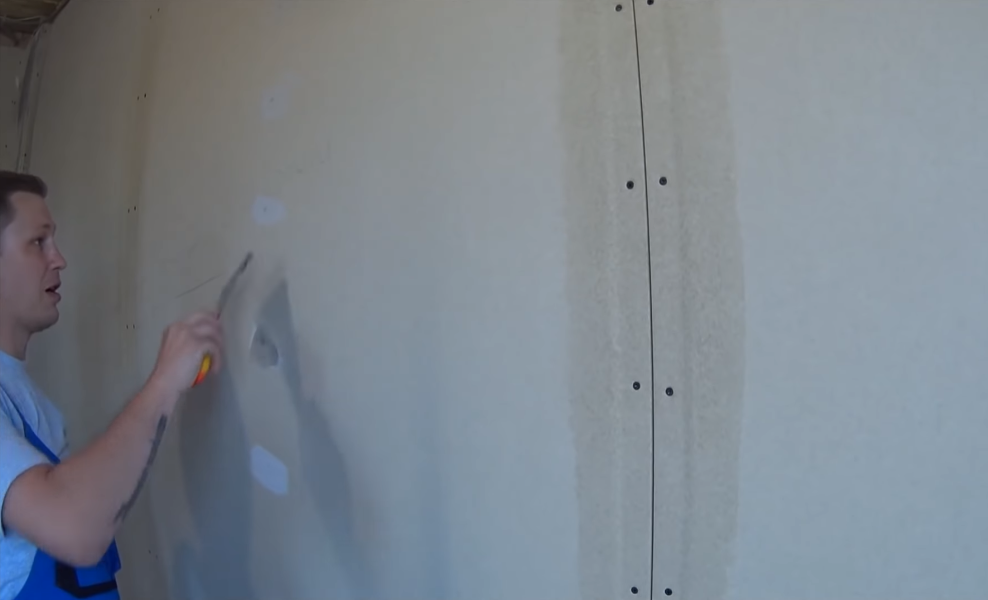 С помощью состава заделываются все саморезы, имеющиеся на поверхности, если гипсокартон монтировался на обрешетку. Состав наносят на стену и снимают, располагая шпатель под углом в 45 градусов;