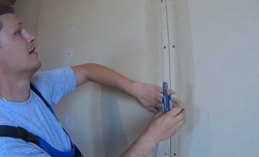 Острым ножом под углом 45°срезается каждый край листа. Правильно выполненный срез образует прямой угол. Он грунтуется и заполняется шпатлевкой. На обработанный стык накладывается армированная лента. После нанесения второго слоя смеси поверхность выравнивается большим шпателем.