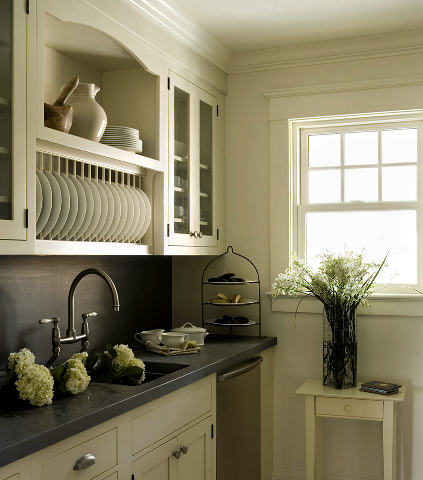 Также вместо полноценной сушилки вы можете разместить над раковиной пару полок в общем стиле кухни