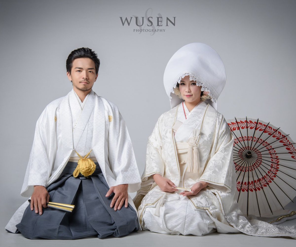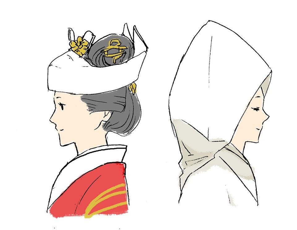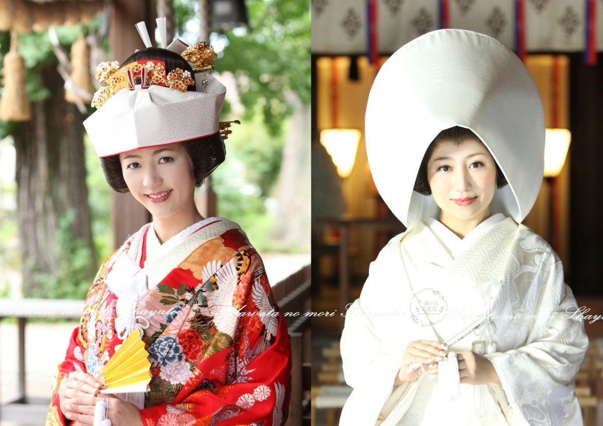 Кимоно, которое носит невеста, называется 白無垢 сиромуку. «Сиро» означает «белый», а «муку» – «чистота». Точно так же, как и белые платья европейских невест, это одеяние является символом девственности. Большая белая шапка невесты называется 綿帽子 ватабоси. Этот головной убор скрывает 文金高島田 бункин-такасимада — специальную и очень высокую причёску для свадьбы. Эта традиция произошла от старых обычаев, согласно которым невеста не должна была показывать своё лицо никому, кроме жениха.