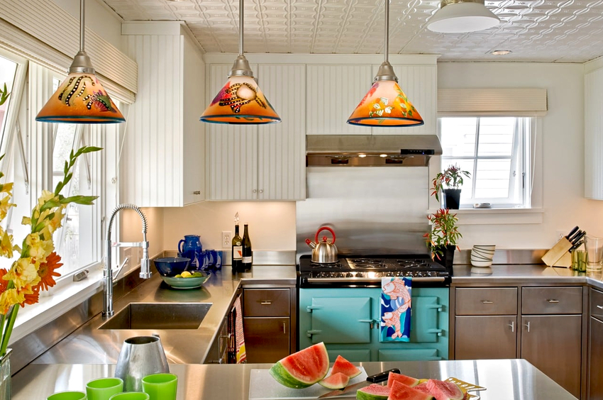 Бирюзовая, голубая или синяя люстра — такие оттенки относятся к наиболее популярным, когда речь заходит о выборе светильника для кухни. Они практически в любом интерьере смотрятся свежо и гармонично. Особенно удачное сочетание — классическая люстра для кухни. С недавних пор в моде светильники бирюзового цвета, выполненные в виде бус. Они станут украшением кухни в стиле арт-деко.