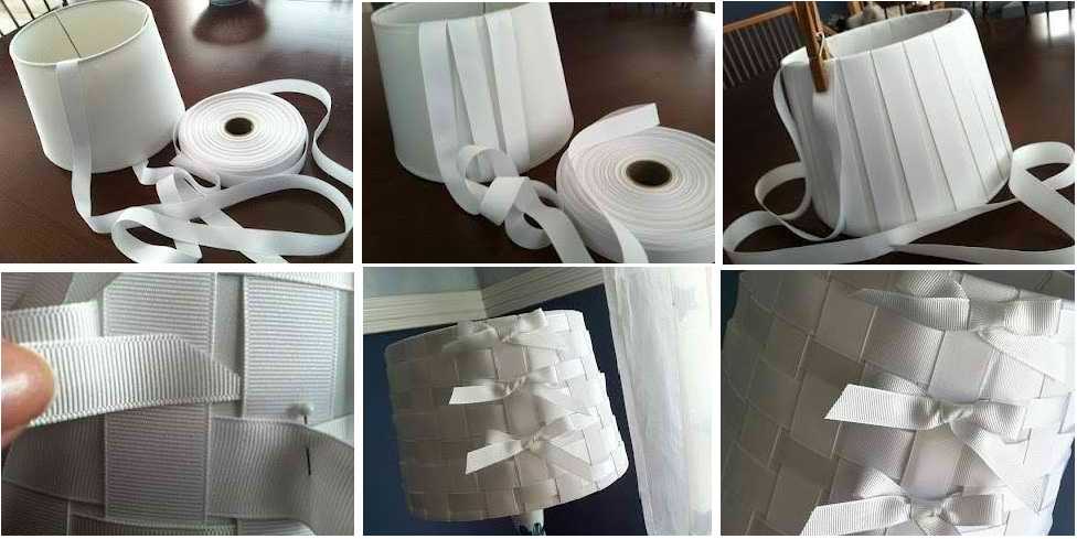 В данном варианте ленты могут быть одинаковыми, могут – одного цвета, но разной фактуры, могут – отличаться на пару тонов или быть контрастными. По кругу ленты можно пускать сплошняком, а можно – через некоторое расстояние. Если найти широкую ленту и накладывать ее с нахлестом, тогда вообще не понадобятся горизонтальные. А если использовать плетеный или крученый шнур (на нижнем фото справа), получим совсем другой по виду абажур. Так что только эта техника отделки абажура дает очень много вариантов.