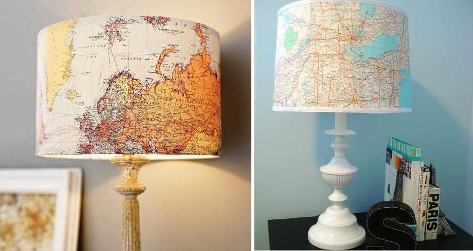 В комнате мальчика можно использовать старую географическую карту. Они есть на плотной бумаге. Если бумага недостаточно плотная, сначала надо наклеить карту на картон, а потом уже из такой заготовки клеить абажур.