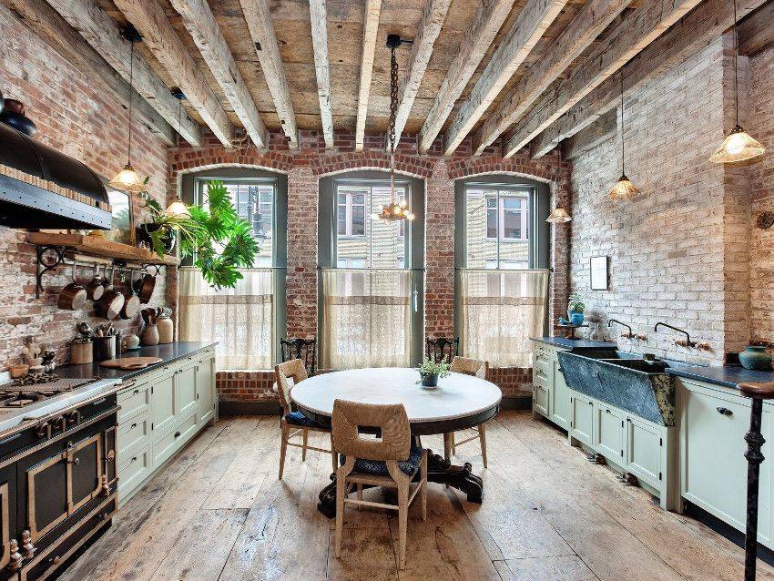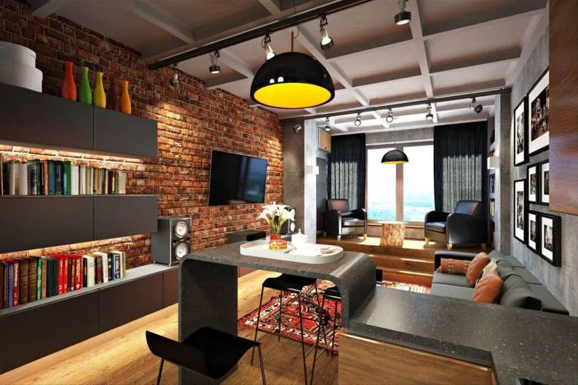 Одна из «фишек» стиля лофт – кирпичная кладка, помимо гостиной, она органично впишется в оформление кухни.