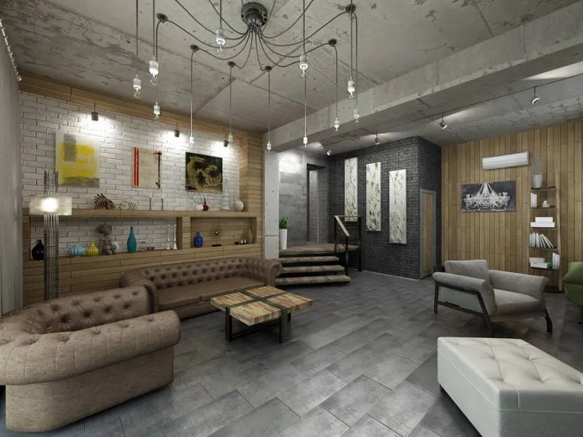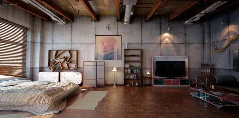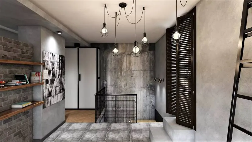 - Отделка простая и грубоватая. Популярный ход – бетонные или кирпичные стены, или отделка штукатуркой под шероховатый бетон.