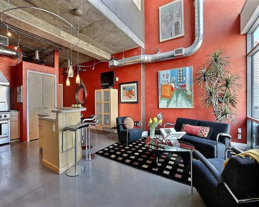 Ошибаются те, кто считает элегантные цвета промышленного стиля унылыми и скучными, тем более что современная интерпретация лофта допускает расширение палитры за счёт более сочных оттенков. В лофт-интерьерах квартир базовые «индустриальные» тона отлично сосуществуют с лиловым, оранжевым, красным цветом.