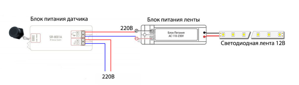 схема подключения всей подсветки рабочей зоны с использованием ИК датчика