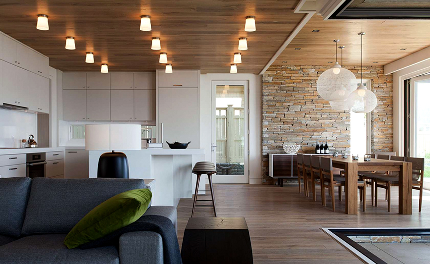 - Отсутствие перегородок и лишних стен. Лучше всего, если в доме будут снесены все ненесущие стены, что позволит объединить все комнаты в одно большое помещение.