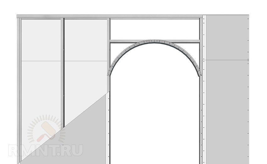 Если стена имеет слой декоративной штукатурки или облицована стеновыми панелями, то крепление каркаса должно проходить к основному материалу стены так, чтобы стенки арки были в одной плоскости с поверхностью самой перегородки, а не её декоративной отделки. Это правило выполняется с каждой стороны арки.