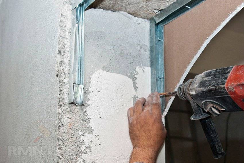 Для стен из кирпича, строительных блоков (газо- или пенобетона, гипса), монолитного бетона ширину стоечного профиля подбирают индивидуально. Часто легче использовать двойной каркас (для каждой стенки арки свой) из узкого CW профиля со спинкой 50 мм, чем подбирать широкий профиль под одинарный каркас. Для крепления к стене используют дюбели, причём для каждого материала подбирают свой вид крепежа. Если каркас монтируют из узкого профиля, отверстия под дюбель, чтобы не раскрошился край проёма, высверливают под углом.