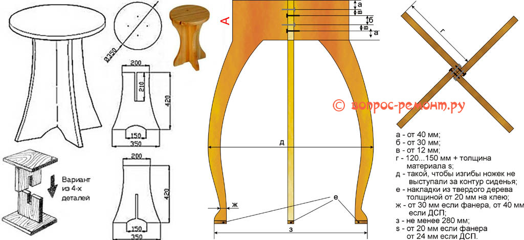 Образец слева на рис. – один из очень немногих видов табуретов, которые можно целиком сделать из ДСП толщиной от 20 мм; ширина соединительных пазов в деталях соответствует толщине материала. Основа собирается на клею (столярный, нитроклей по дереву, ПВА или полимерный для плитки вроде бустилата). Крепеж сиденья – саморезы по дереву или винты-конфирматы (60-90)х6 мм. Винтовые соединения также с проклеиванием.