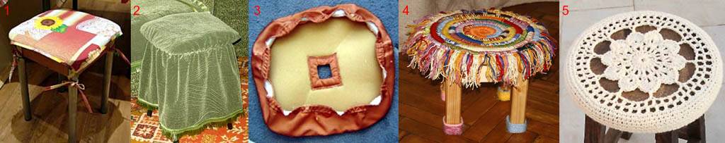 Чехлы для табуретов изготавливаются в основном следующих видов, см. рис. Поз. 1 – накидка на завязках. Сшить такую проще всего, но завязки торчат на виду, и возни с ними много, особенно если табурет детский и малыш что-то там свое посоображал с узлами.