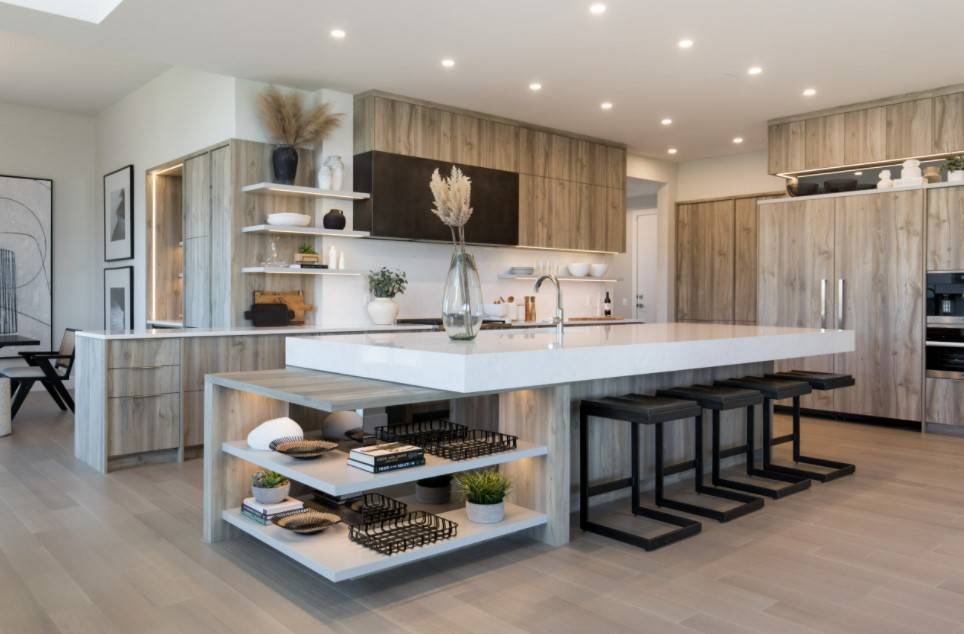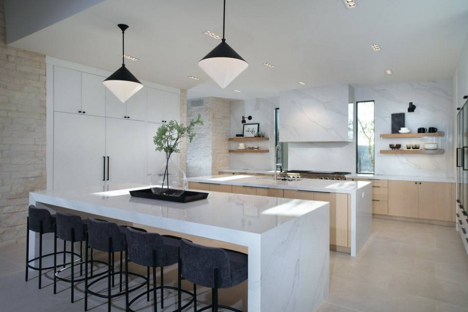 В 2022 году приемлемо использовать для этих целей сочетания различных по структуре отделочных материалов, о чём мы упоминали выше. А также применять такой дизайнерский ход, как барная стойка, остров либо полуостров.