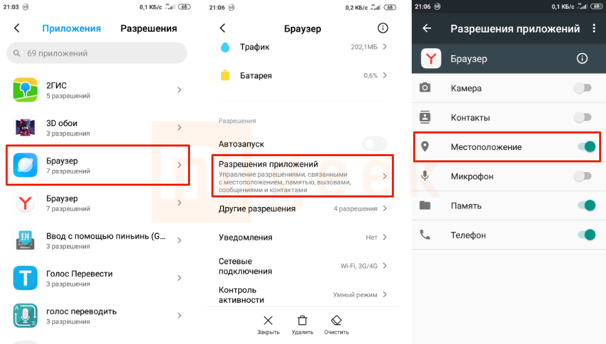 В открывшемся списке находим нужное приложение, переходим в «Разрешение приложений» и уже там отключаем доступ к Местоположению.