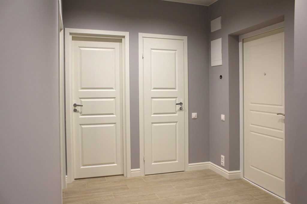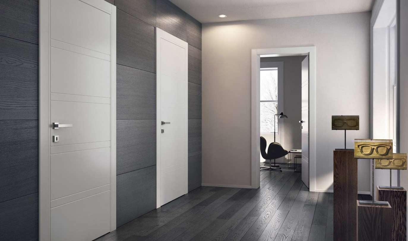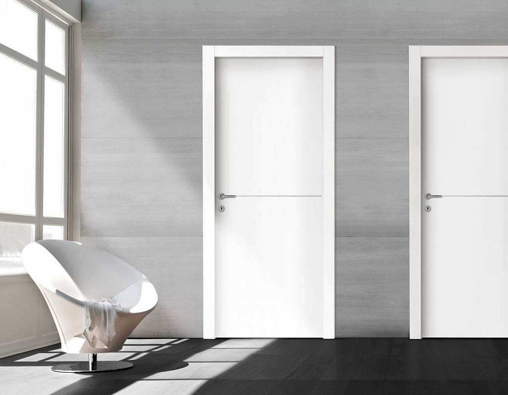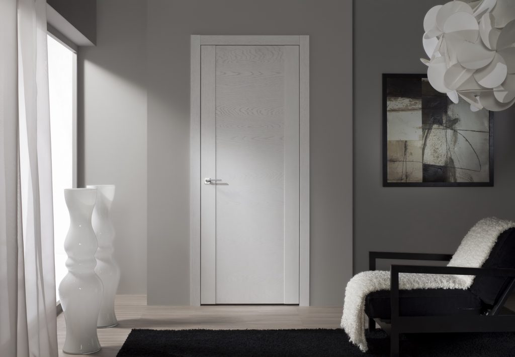 Самый простой вариант, когда выбор отдается в пользу гладких белых дверей. Полотна окрашиваются белой эмалью либо обшиваются панелями МДФ, ламинатом. Такие модели дверных конструкций недорого стоят, используются в офисах и помещениях, предназначенных для проживания.
