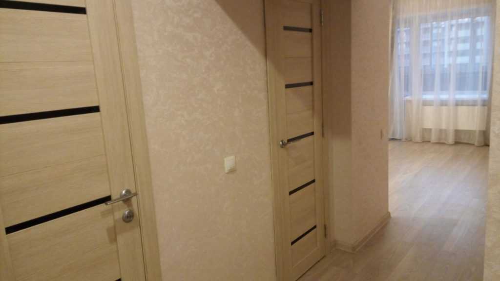 Их можно выбирать для прихожей и коридора. Но эти помещения обычно небольшие, и в них нет окон, поэтому ваша задача — визуально сделать их просторнее. Для отделки стен лучше выбрать светлые обои или другую отделку. Удачные цвета, которые уравновесят темное полотно — белый, светло-серый, песочный, бежевый, светлый розовый или зеленый. Входная и межкомнатная дверь могут быть одного цвета. Входная может быть и темнее. Для визуального увеличения пространства можно выбрать межкомнатную дверь со стеклянной вставкой.