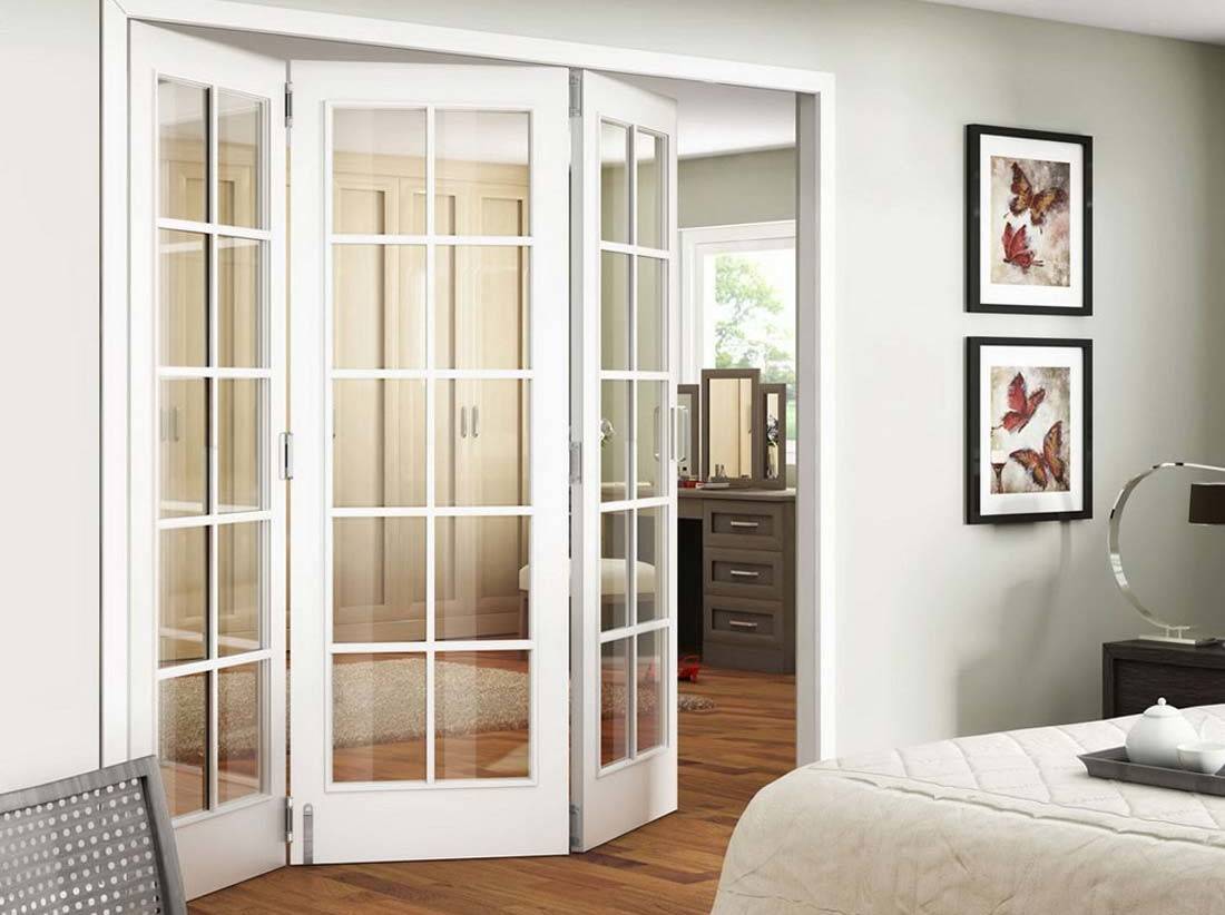 Из всех дверных конструкций также можно выделить складные модели. Тип открывания чаще всего предполагает механизм гармошка. Хорошо если такие двери будут со вставками из прозрачного стекла — такая конструкция выглядит легко и воздушно.