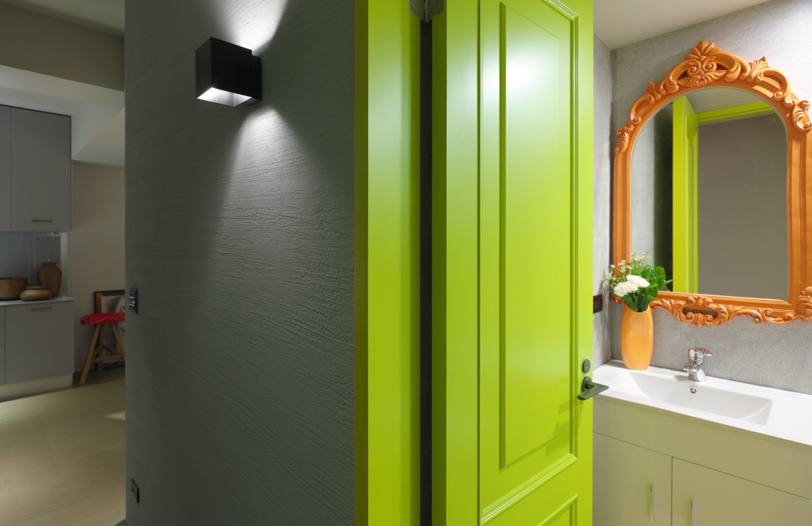 Нестандартным вариантом дизайнерского решения является добавление ярких акцентов в дверные блоки. Покрашенная в желтый, зеленый, оранжевый или красный цвет дверь выглядит достаточно стильно. При этом помните, что такая дверь должна сочетаться с каким-то элементом интерьера. Если окрасить плинтус под фон дверного полотна, то можно логически завершить данную композицию.