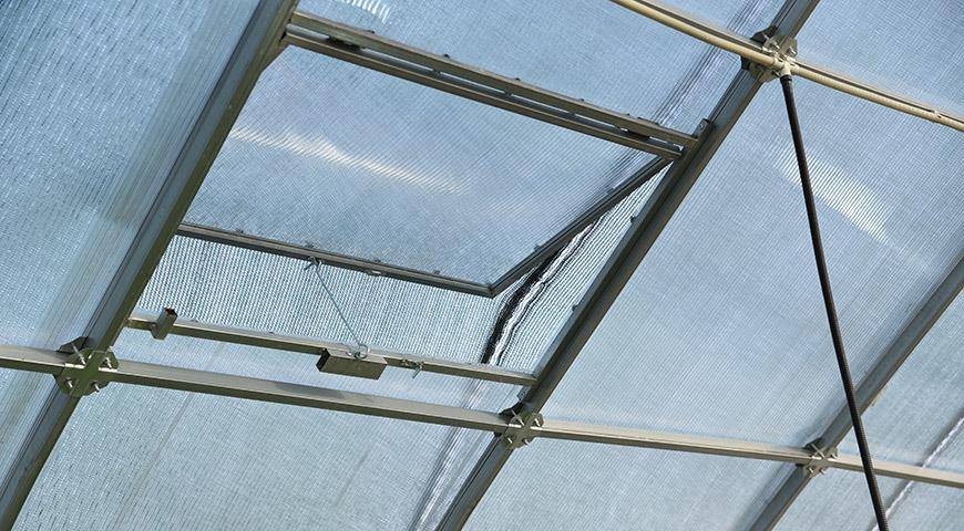 Чтобы предотвратить перегрев в жаркие летние дни, необходимо обеспечить возможность регулярного поступления воздуха в теплицу, особенно это важно для поликарбонатных теплиц, которые значительно теплее стеклянных теплиц и пленочных туннелек. Форточек в верхней части дверей бывает недостаточно, поэтому желательно предусмотреть дополнительные форточки проветривания в боковых стенах и на крыше
