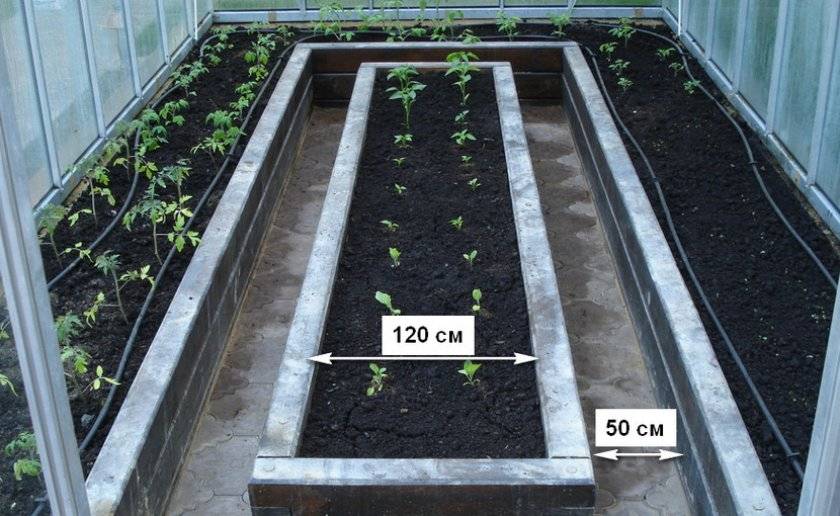В зависимости от ширины теплицы, в ней устраивают две или три грядки. При ширине сооружения в 6 метров рекомендуется сделать: