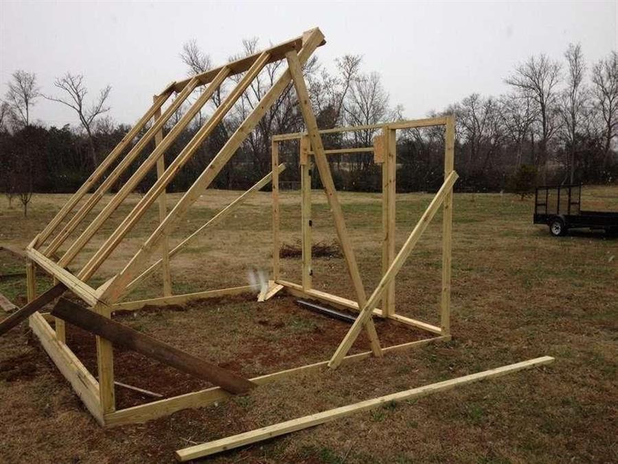 Сперва установим на земле основание и начинаем сооружать боковой каркас имеющий наклонное положение из деревянных брусов