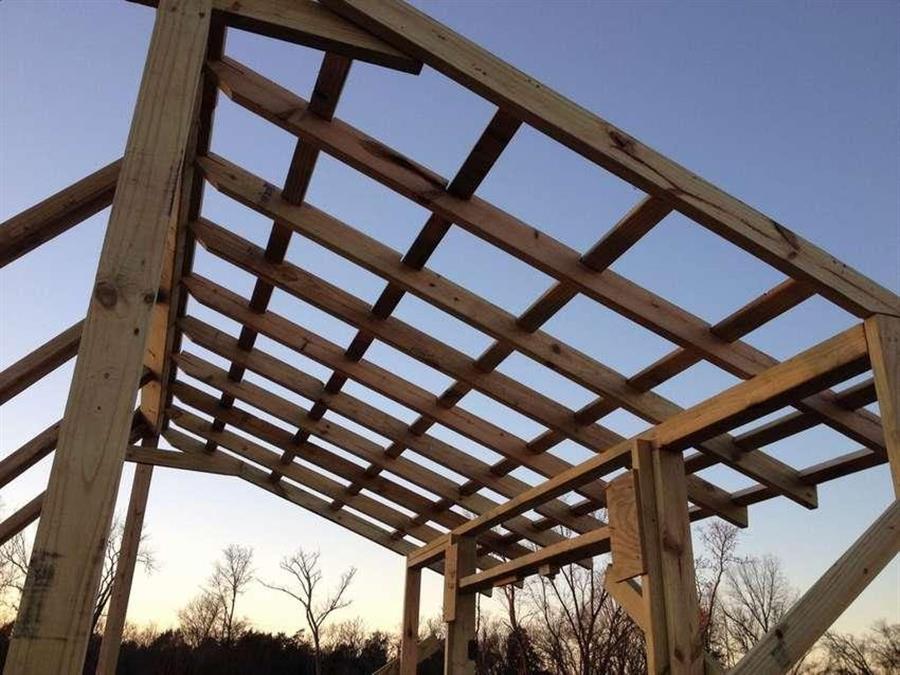 - Соберите каркас крыши из балок и стропил, соберите и повесьте дверь, установите форточки.