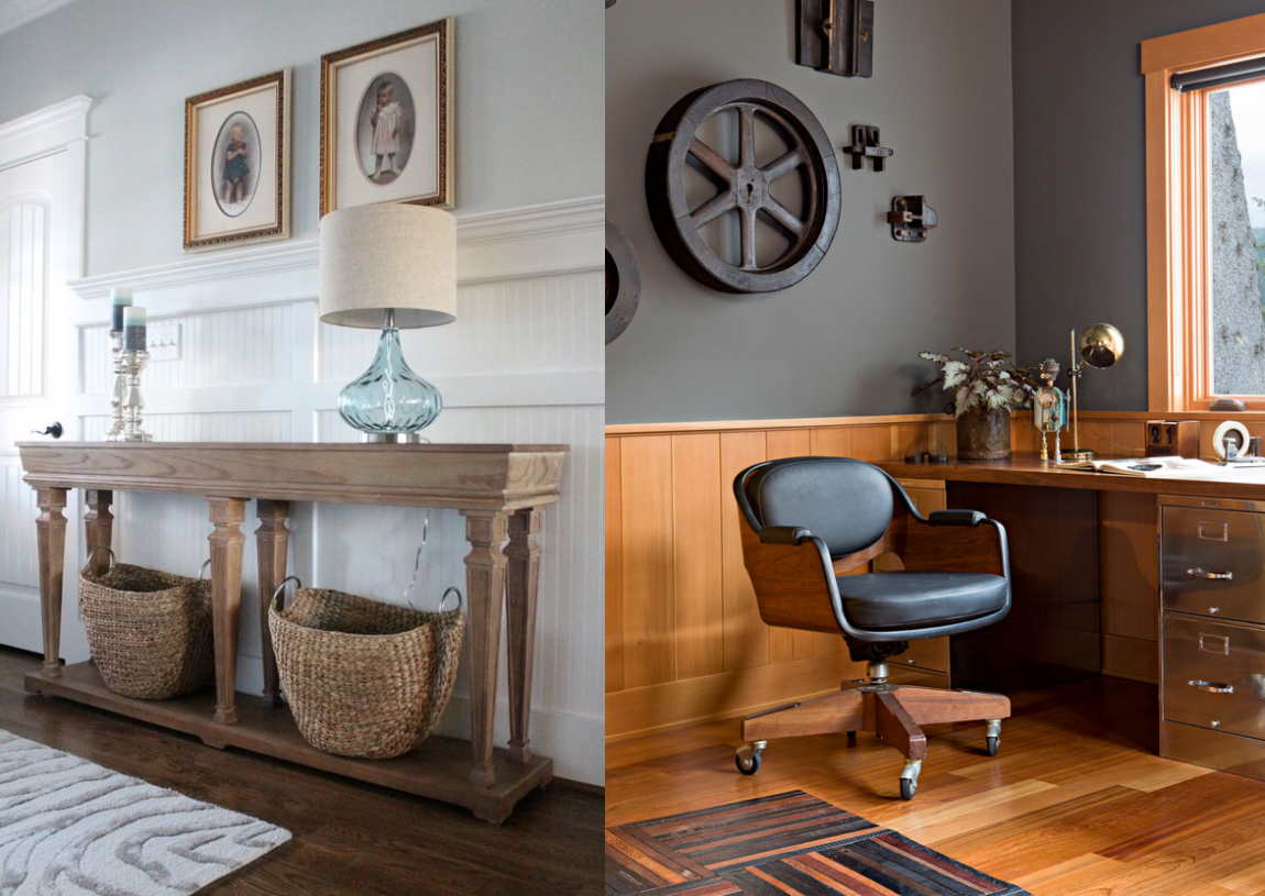 Традиционно такие панели изготавливали из массива дуба, сегодня вайнскот делают даже из МДФ или имитируют с помощью досок и молдингов. Так реечная версия вайскота — это по сути вагонка с горизонтальным рейлингом.