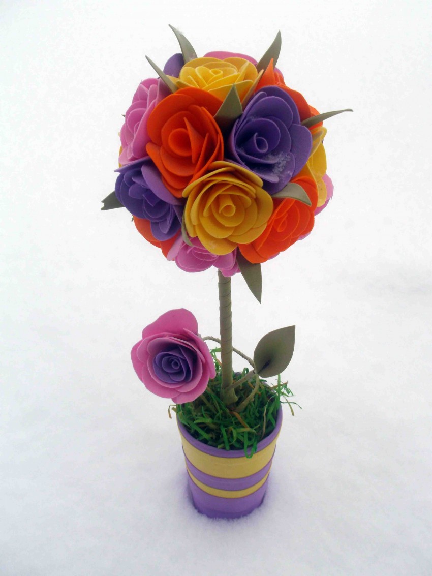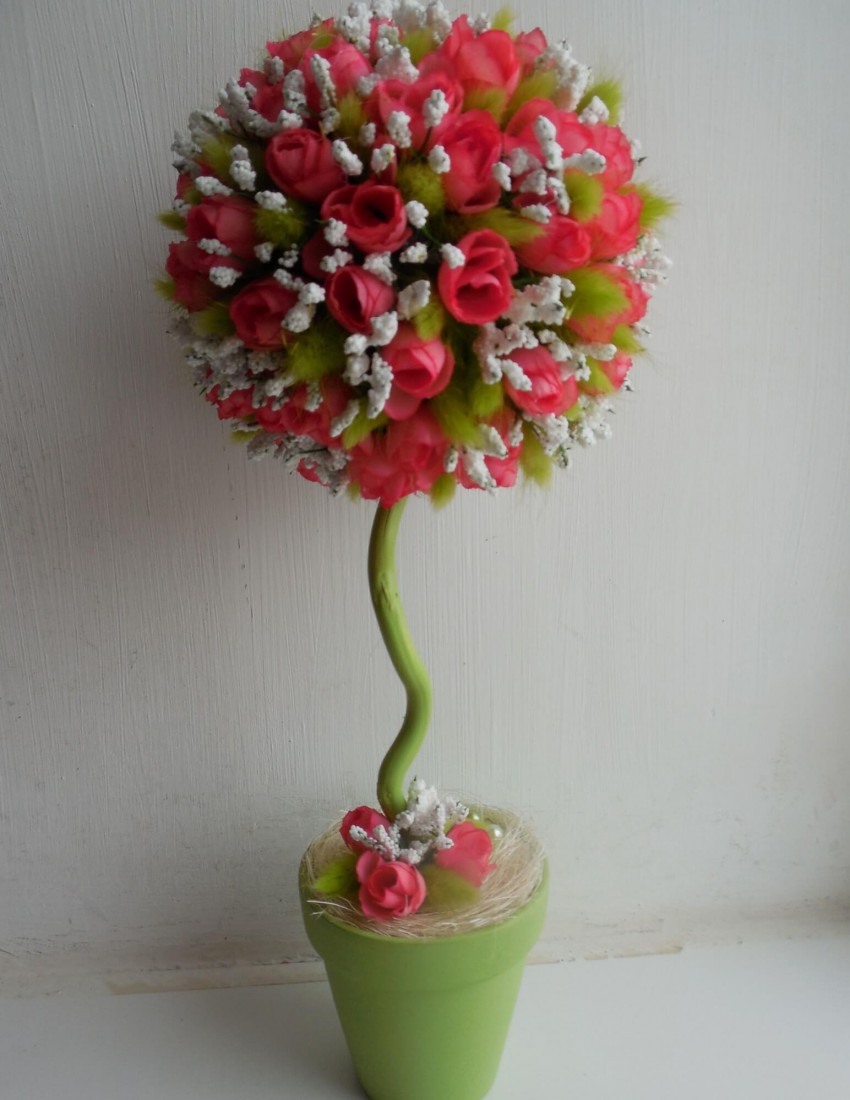 Топиарий из искусственных цветов может стать постоянным украшением обеденного стола, шкафа-витрины, журнального столика, каминной полки. При чем в большинстве случаев лучше делать сразу два одинаковых деревца, чтобы создать ощущение симметрии в интерьере. А еще топиарий из искусственных цветов – отличная идея для подарка или украшения свадьбы.