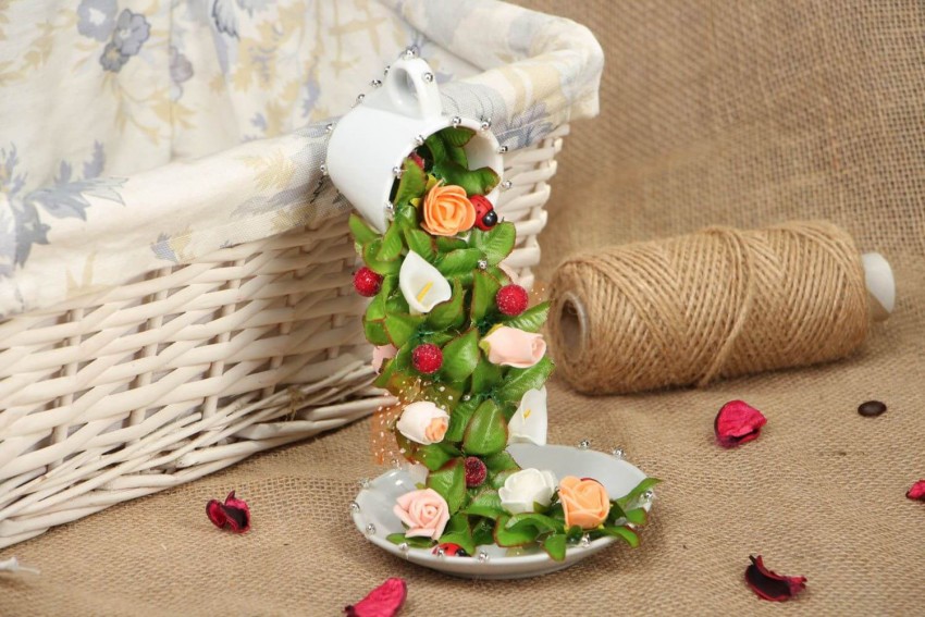 Если не удалось подобрать что-то красивое вам по душе, то возьмите кружку или обычный однотонный горшочек и украсьте его сами, согласно задуманной композиции. Главное, помнить о том что, даже незначительные детали на вазе или кружке, сделают ваш топиарий единственным и неповторимым, и, конечно же, все сделанное с душой всегда очень ценится.