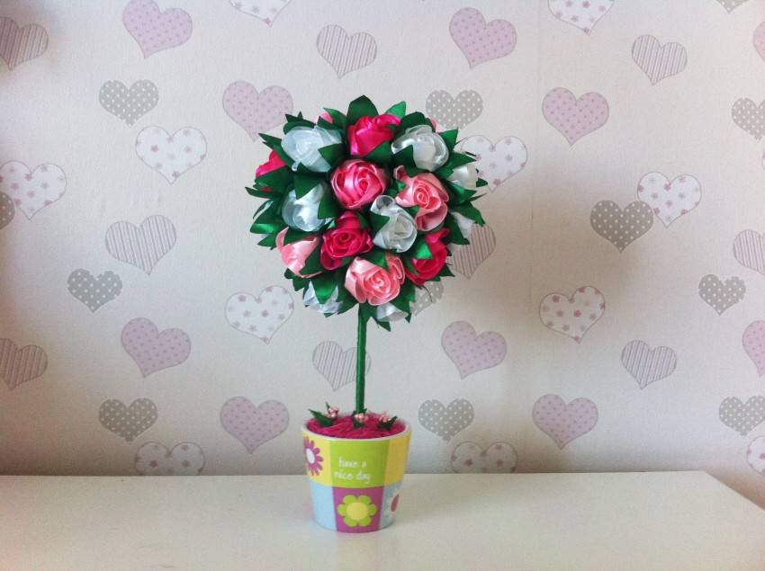 Топиарий оформляется повязанным на стволовую часть красивым бантиком.