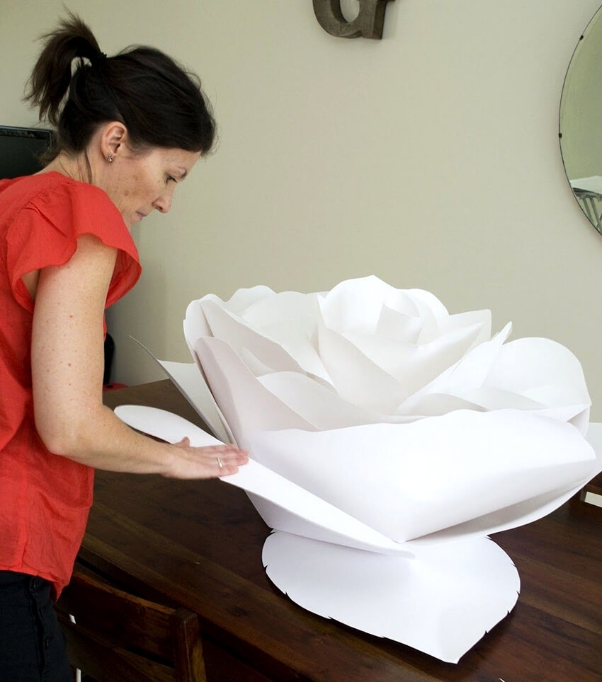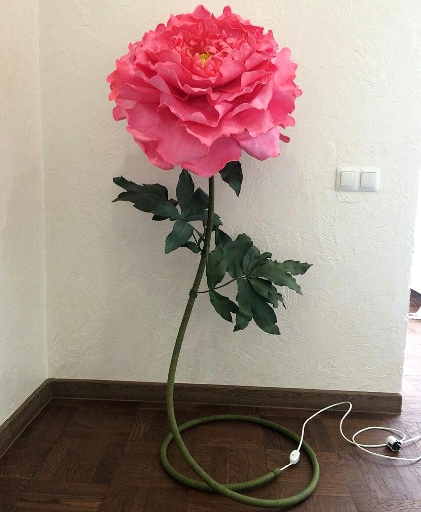 Затем материалу придают форму с помощью горячего потока воздуха от фена. Собирают цветок на клей, начиная с маленьких лепестков в центре, заканчивая большими по краям. Чтобы конструкция не помялась из-за воздействия тепла от лампы, можно использовать диодную ленту.