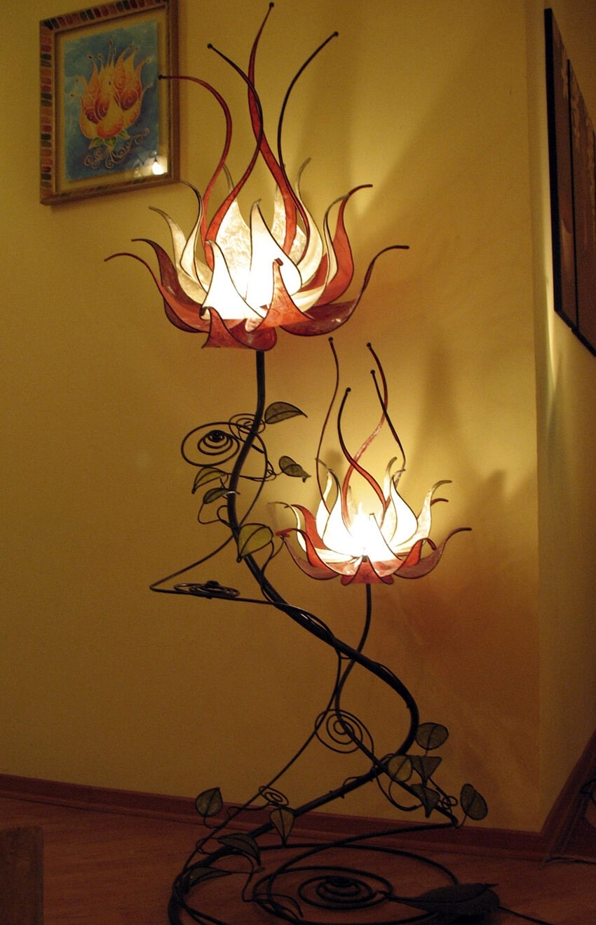 Торшер-ваза. Изящный предмет интерьера не предназначен для живых цветов. Основу из вазы дополняют галогенные лампы в виде растений или классический абажур.