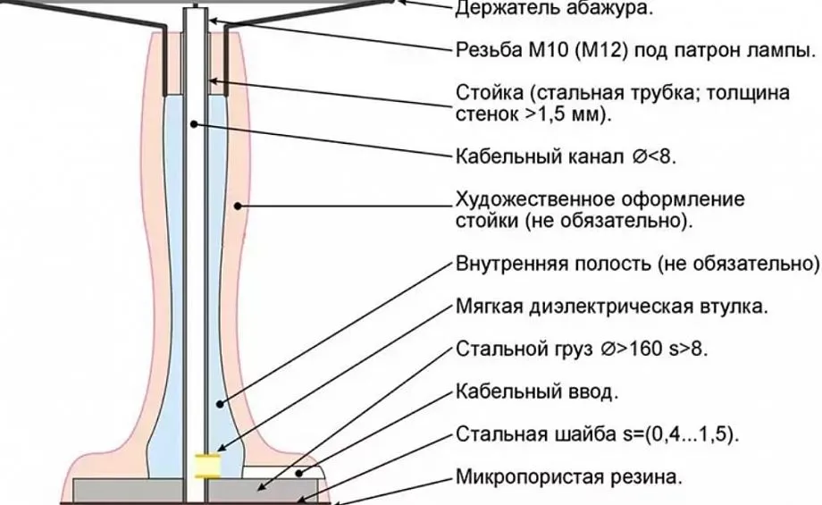 Независимо от того, какие материалы используются для сборки торшера, он включает в себя три ключевых элемента: ножку, подставку и абажур. Чтобы облегчить свою работу, рекомендуется заранее подготовить чертеж с указанием точных размеров каждый детали.