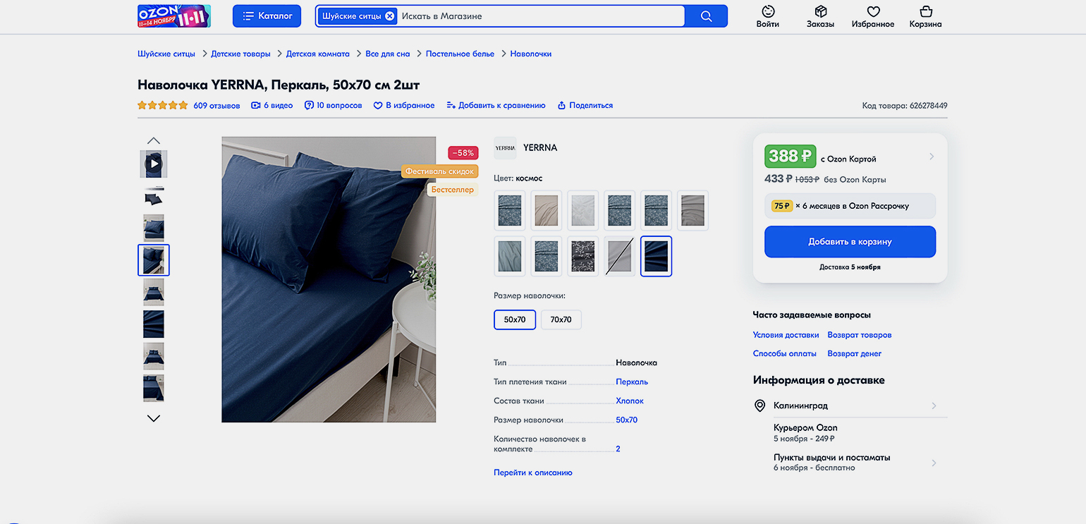Набор наволочек из перкаля — хлопка с особым плетением нитейСкриншот: сайт Ozon / Skillbox Media