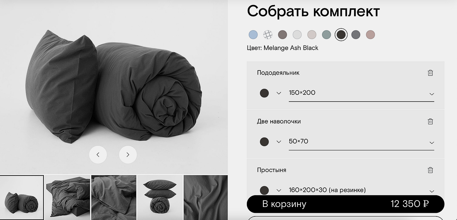 Комплект из наволочек, пододеяльника и простыни можно собрать именно под свои размеры кровати, одеяла и подушек — как в IkeaСкриншот: сайт «Morфeus» / Skillbox Media